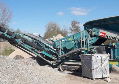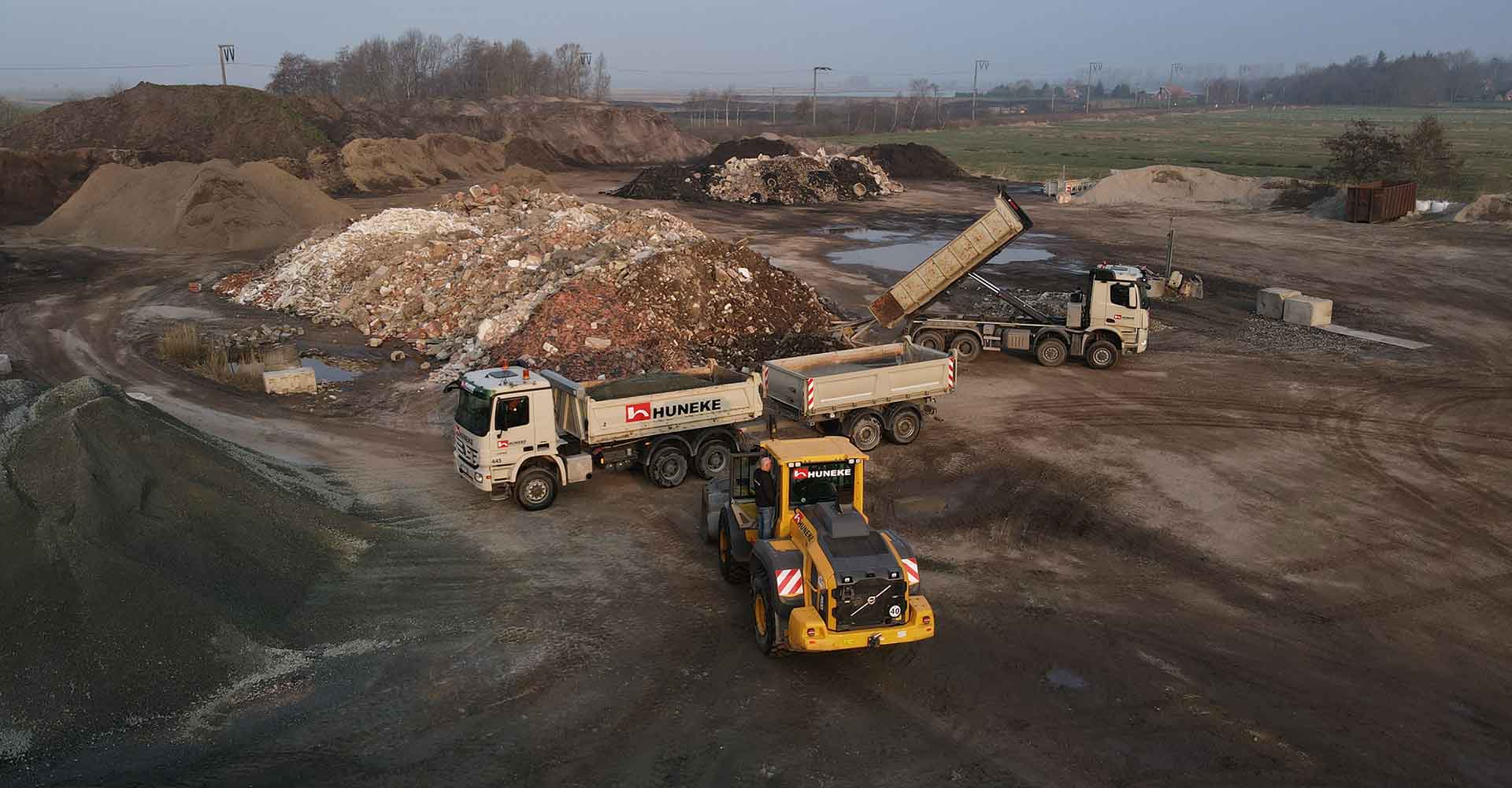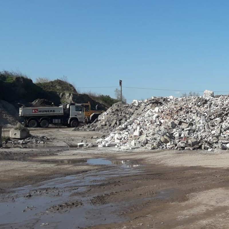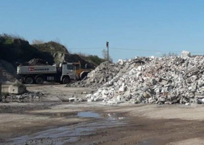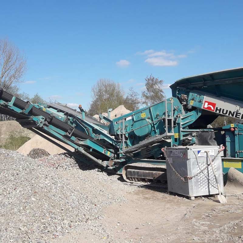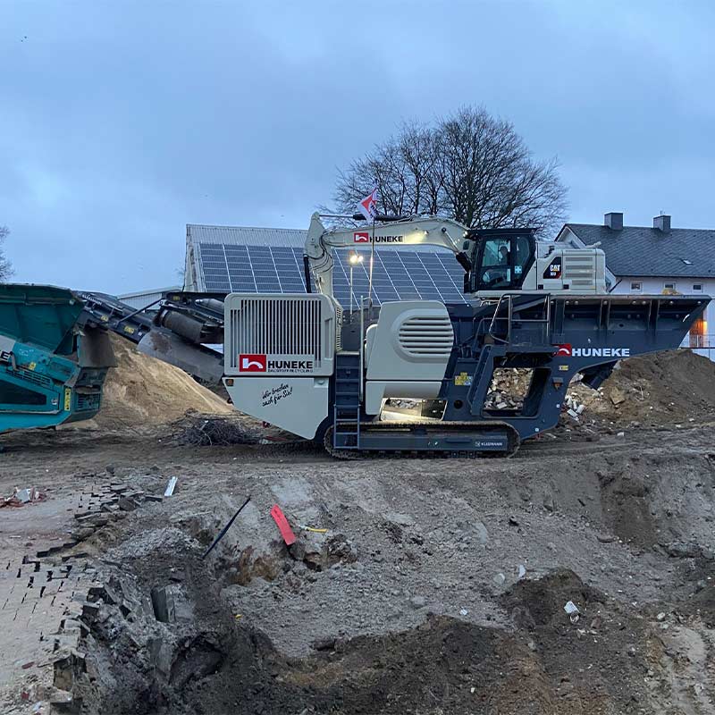 Mit unserem Recyclingplatz geben wir Materialien aus dem Rückbau von Gebäuden oder Straßen eine neue Nutzung. Auf dem ca. 3 ha großen Platz in Veenhusen trennen wir Ziegel- und Betonbruch und lagern diesen sortenrein zwischen. Mithilfe unseres firmeneigenen Backenbrechers zerkleinern wir das Material auf bis zu 32 Millimeter Körnung. Durch die nachgeschaltete Siebanlage sortieren wir neben dem Hauptmaterial (Recyclingschotter bis 32 Millimeter) auch Material der Fraktion bis 8 Millimeter heraus.