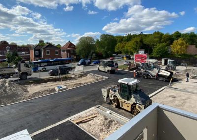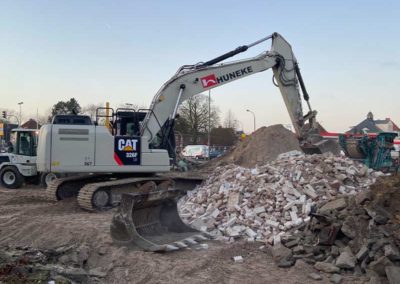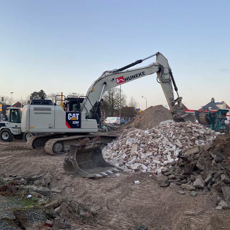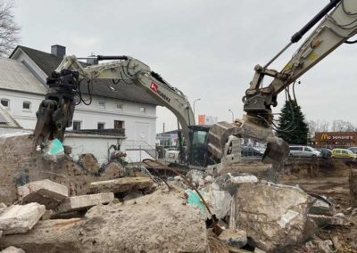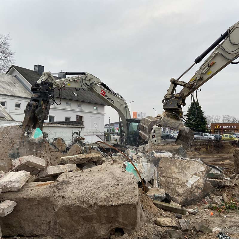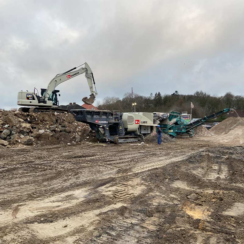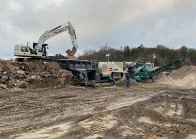 Zunächst haben wir das Baufeld geräumt und hierfür eine Bestandsimmobilie abgebrochen sowie vorhandene Oberflächenbefestigungen zurückgebaut. Das Abbruchmaterial wurde vor Ort mit unserer Brechanlage gebrochen, zwischengelagert und später wieder eingebaut.