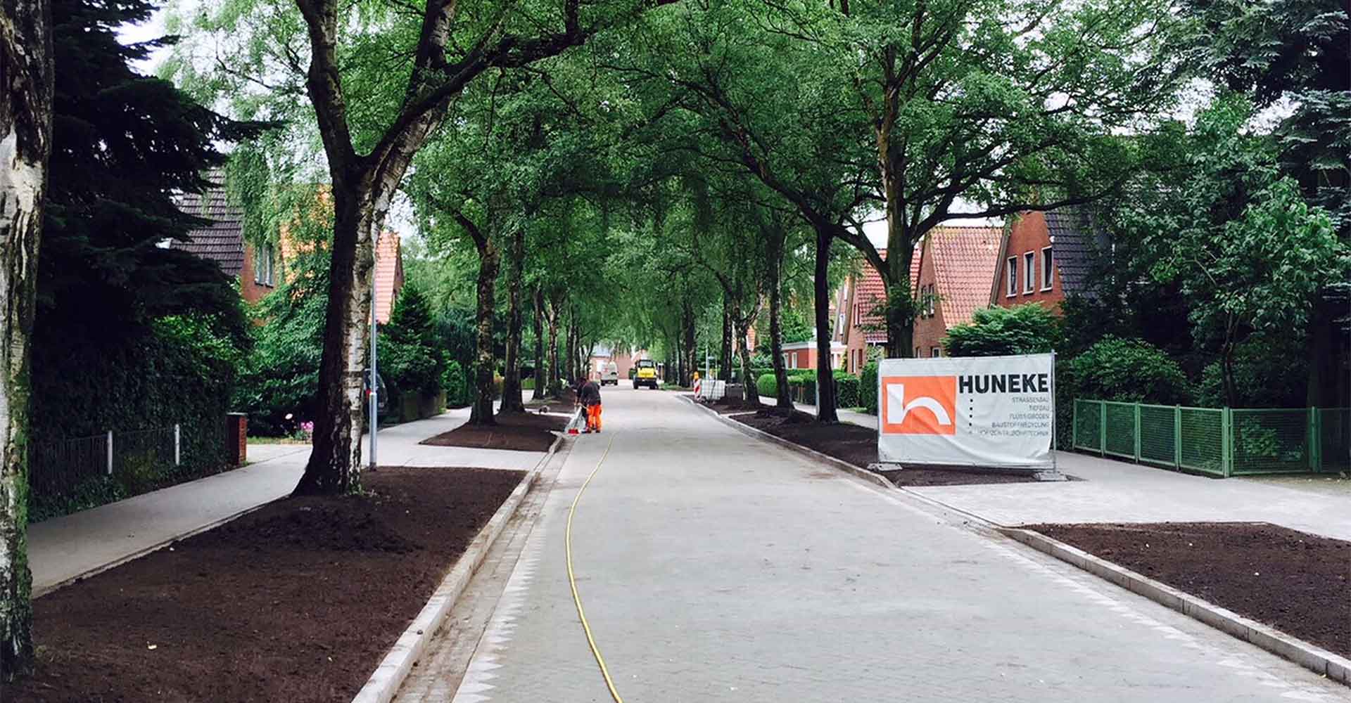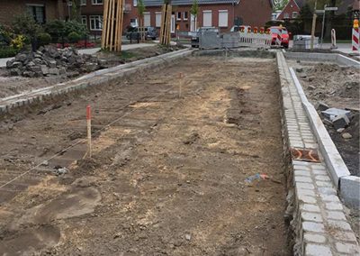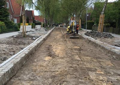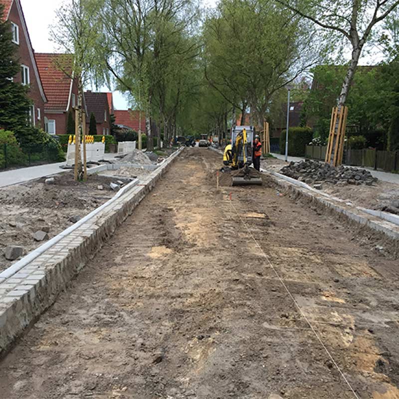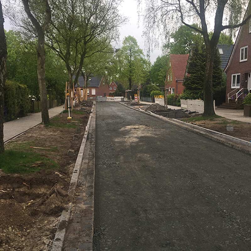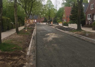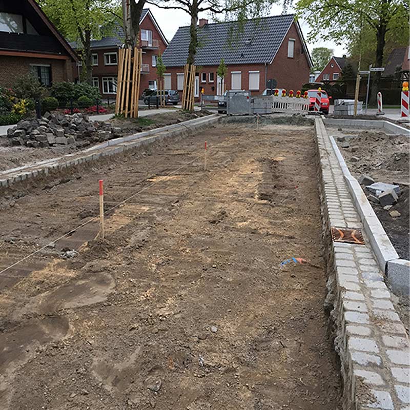 Im Rahmen der Baumaßnahme hat unser Team die Oberflächenbefestigungen (Rechteckpflaster, Gehwegplatten, teerhaltige Befestigungen) aufgenommen und entsorgt. Anschließend haben wir einen neuen Straßenunterbau hergestellt aus Füllsand und einer Schottertragschicht. Zudem ist eine neue Oberflächenentwässerung entstanden. Die Gehwege und die Fahrbahn haben wir mit Natursteinbord eingefasst und die Flächen mit neuem Betonrechteckpflaster gepflastert.