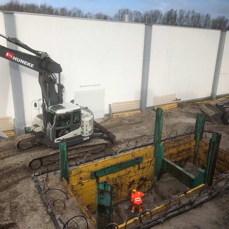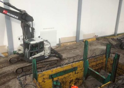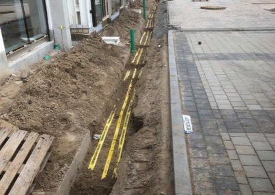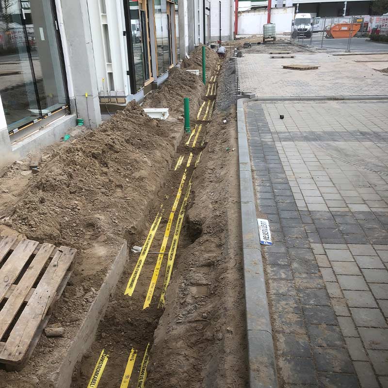 Zunächst haben wir die Bodenplatte und die Grundleitungen in Teilbereichen der Geschäftsflächen zurückgebaut. Anschließend hat unser Team neue Grundleitungen verlegt und verschiedene Fettabscheider (mit Wasserhaltungsmaßnahmen) eingebaut. Auch diverse Kabelleerrohre haben wir verlegt.