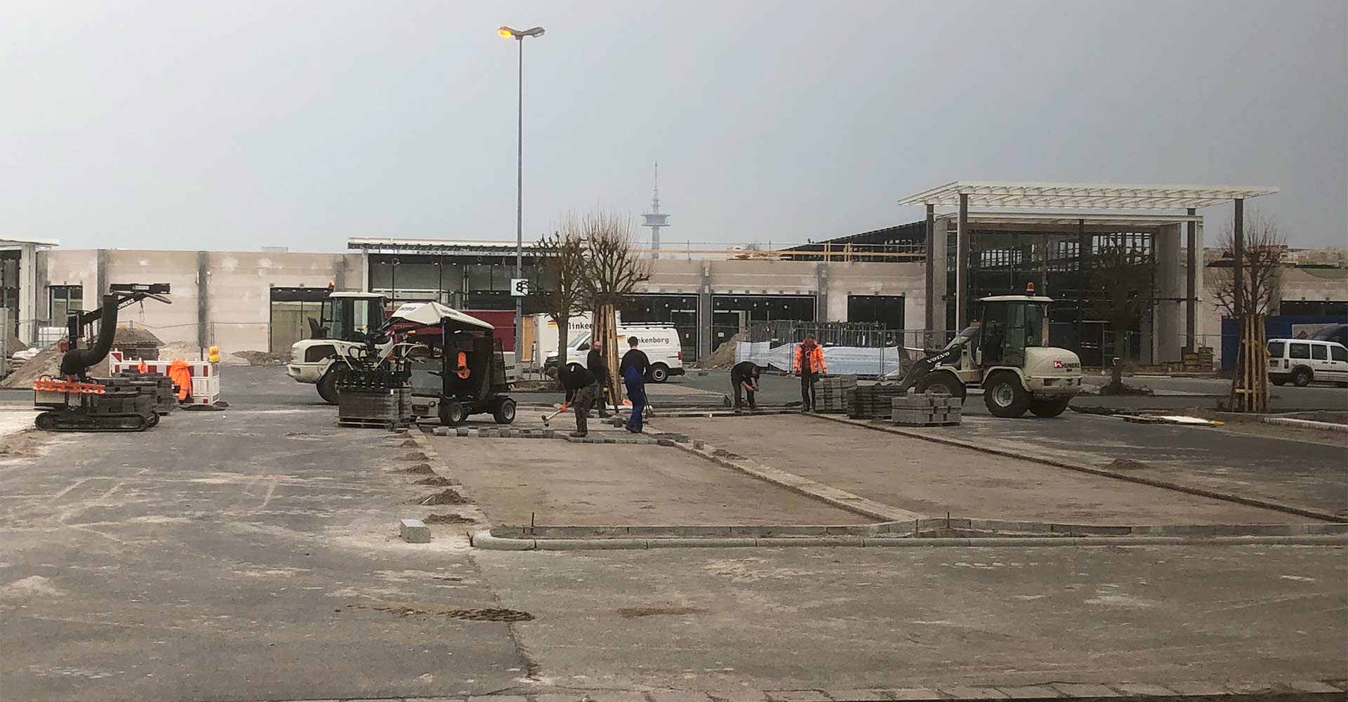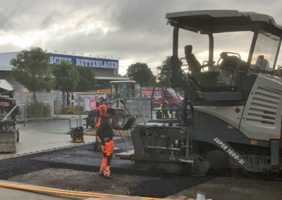 Dann folgte der Rückbau von Pflaster- und Asphaltbefestigungen im Bereich des Außenbereichs. Hierbei haben wir einen Bodenaushub für einzelne Fundamente vorgenommen und dann ein neues Pflaster-Planum hergestellt. Auch die Oberflächenentwässerung haben wir neu verlegt. Außerdem haben wir die Einfassungen für Pflaster- und Asphaltflächen neu hergestellt und grabenlos Rohre verlegt mittels unserer HDD-Horizontalbohrtechnik. Zudem hat unser Team Kabelleerrohre für die Außenbeleuchtung hergestellt und eine Winkelstützwand errichtet. Schließlich folgte die Herstellung von Asphalt- und Pflasteroberflächen.