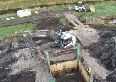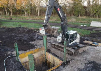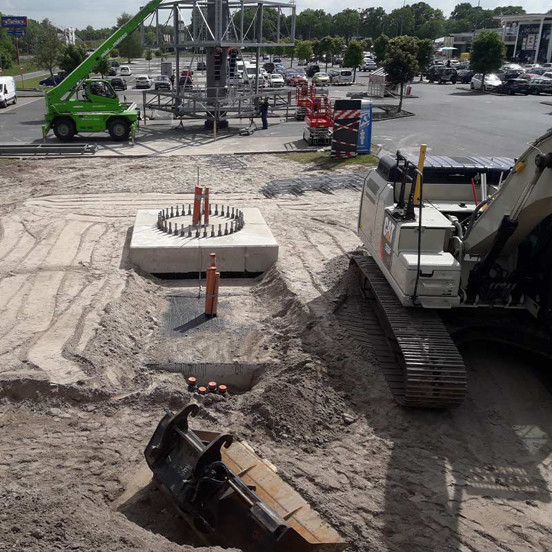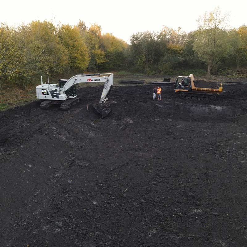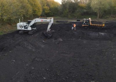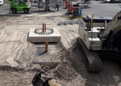 Im Rahmen eines weiteren Auftrags haben wir das Fundament des Werbepylons mit Füllsand angefüllt, Geotextil verlegt und Natursteinschotter eingebaut. Zudem hat unser Team eine Wartungs- und Montagefläche als wassergebundene Wegedecke hergestellt. Für die Erstellung eines Regenrückhaltebeckens haben wir das Baufeld freigemacht (Rückschnitt und Fällen einzelner Bäume). Darüber hinaus haben wir ein Regenrückhaltebecken hergestellt, überschüssiges Bodenmaterial abgefahren und das Regenrückhaltebecken gegenüber dem anstehenden Grundwasser mit Kleiboden abgedichtet. Dabei führten wir auch die Verlegung der Zulaufleitung zum Rückhaltebecken sowie der Einbau eines Pumpwerks und einer Druckrohrleitungen als Ablauf des Rückhaltebeckens aus.